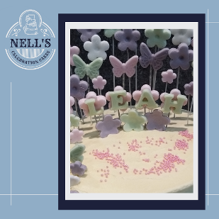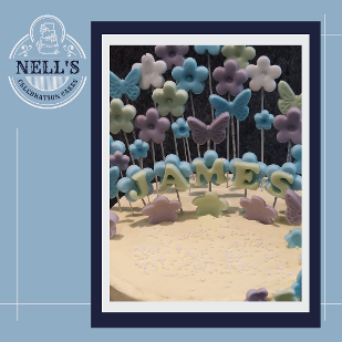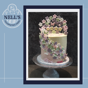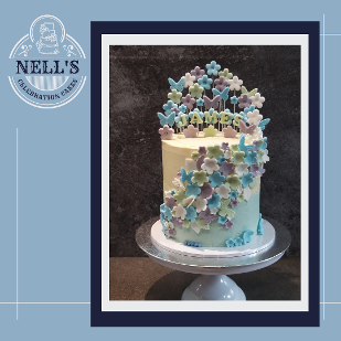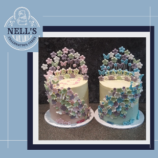A double Christening calls for a double cake and these were specifically designed for the occasion. When placed side by side, the cakes form a heart, but equally, they can stand alone with the asymmetric design. Each cake was 5 layers of 6" sponge, one vanilla with strawberry Swiss meringue buttercream and the other chocolate sponge with Kinder Swiss meringue buttercream. Both cakes were then covered with ombré effect vanilla Swiss meringue buttercream and then festooned with sugarpaste flowers and butterflies.