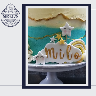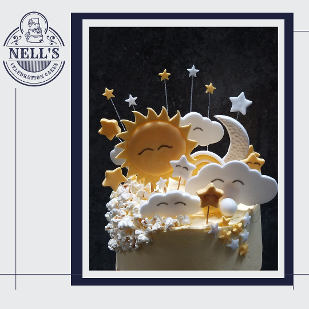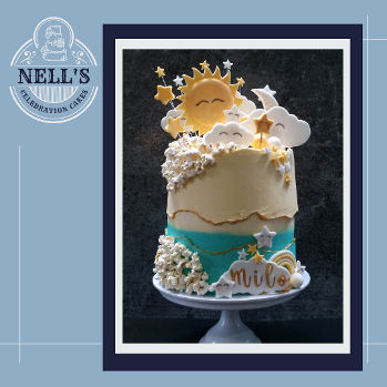 This cake was made for a big celebration that needed a big cake! 6 layers of 8" chocolate sponge filled with real chocolate buttercream. The cake was then decorated with an ombré fault line, highlighted with gold and then finished with fondant clouds, stars, sun, moon and, of course, popcorn.