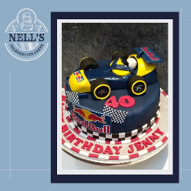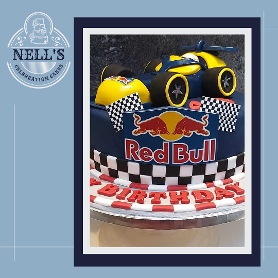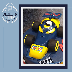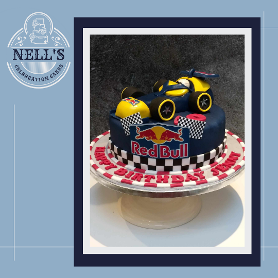 This cake was designed especially for the special birthday of a Red Bull Racing fan. Inside there is an 8" luxury chocolate biscuit cake which was then covered with fondant before being festooned with racing-themed decorations, including a model of the racing car itself. Everything is edible, apart from the driver's helmet!