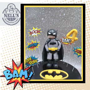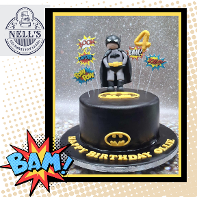 Some super heroes never go out of fashion and Batman is certainly in it for the long haul! The first cake was designed for Ollie, celebrating his fourth birthday. Inside there is a 4 layer 8" chocolate sponge with real chocolate buttercream filling. The fondant covering was actually white fondant, spray painted to get the black look without the need for lots and lots of food colouring. The figure is handmade and he's surrounded by some of the iconic words from the TV series. The second cake is a simple yet striking Batman cake for a young man alsoturning 4! Inside there is an 8" luxury chocolate biscuit cake.