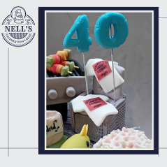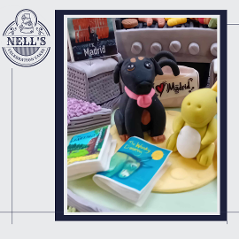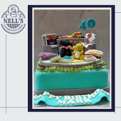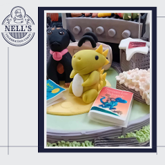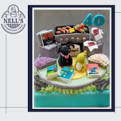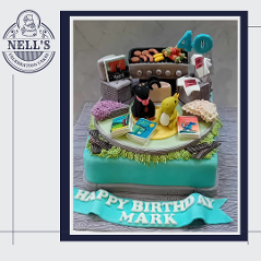 I was just thrilled to be asked to design and make this cake. The brief was to include references to Mark's outdoor kitchen, his love of Bruce Springsteen, his beautiful children and his first born - the family dog, Lexi. Everything you see is edible and made by hand. The BBQ scene is on it's own aboard on top of an 8" luxury chocolate biscuit cake. Although Mark wasn't Born in the USA, he's certainly now in his Glory Days!