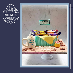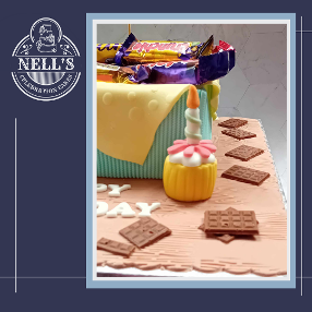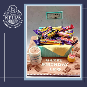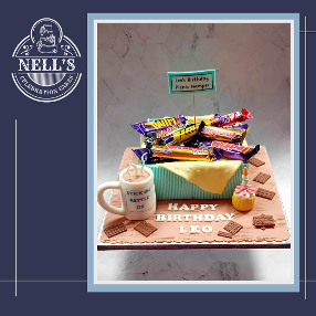 Chocolate explosion cakes are always popular but this time I went a different route! The basket is an 8" square chocolate biscuit cake decorated with a fondant picnic blanket and filled with a selection of Leo's favourite treats. Of course, the perfect accompaniment to the bars is a cup of tea in Leo's favourite mug, handmade from fondant and, lastly, a miniature fondant cupcake, complete with birthday candle!