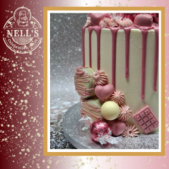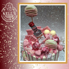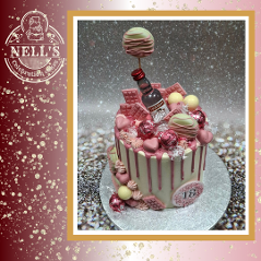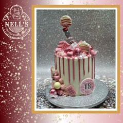 Drip-excess cakes are a feast for the eyes as well as the stomach. This cake has a bright pink drip and lots of girly accents to draw the design together including hand made chocolate decorations. The cake itself is 5 layers of 6" vanilla sponge with vanilla buttercream filling. With the vodka mini, it's perfect for an 18th birthday.