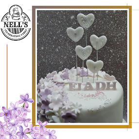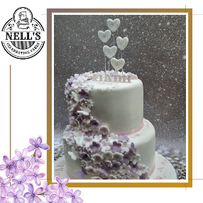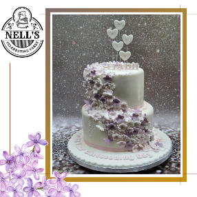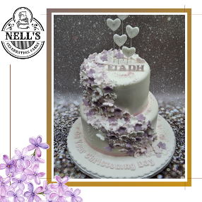 This is Fiadh's Christening cake - two tiers of lemon sponge with vanilla buttercream, covered with fondant and festooned with pink, purple and white flowers