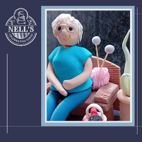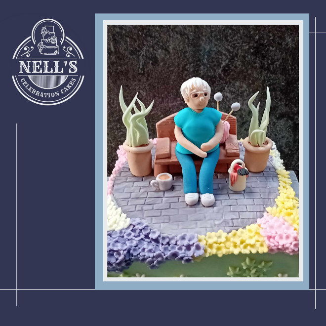 This cake was made for Tricia who was retiring. The cake shows Tricia relaxing in her beautiful garden, her knitting and her mug of tea. There's also a pot of paint beside her as Tricia always keeps everything neat and tidy!