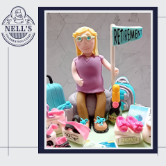 My favourite kind of design is, without doubt, one that tells a person's story. This cake was for Carmel who retired recently. Included on her cake were references to her job, her future plans and her hobbies.