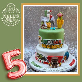 The theme for this cake was completely new to me - I'd never even heard of it! Italian Brainrot combines animals with everyday objects and a smattering of Italian. The models on this cake are Jaxon's favourites. The bottom tier is chocolate biscuit cake and the top tier is zesty lemon sponge with white chocolate buttercream filling. Happy birthday, Jaxon!