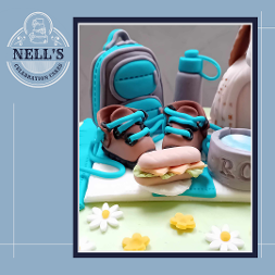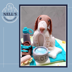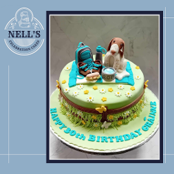 When GrĂ¡inne turned 30, her mum ordered a cake featuring her daughter's favourite pastime - hiking with her beloved dog, Roo. The scene shows Roo sitting on a picnic blanket surrounded by some hiking essentials, including a miniature roll for lunch! The cake itself is 3 layers of 10" vanilla sponge with a creamy vanilla buttercream filling.