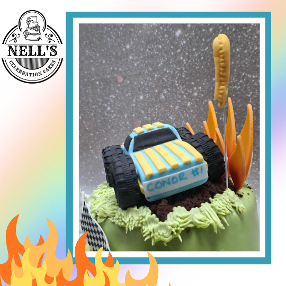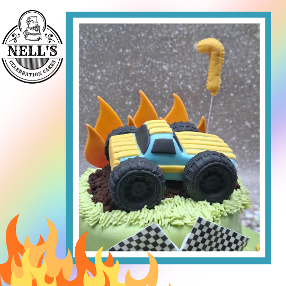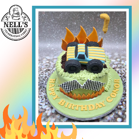 This was my second first birthday cake of the week and it's a very different theme, this time Monster Trucks! The cake itself is chocolate sponge with a milk chocolate ganache filling, covered in fondant. The decorations are all hand made and the "hill" the truck is climbing is made from cake crumbs so everything is edible! Happy birthday, Conor!