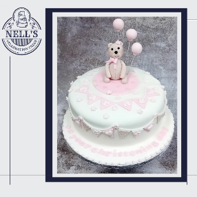 It was so lovely to make this cake for a little girl celebrating her Christening. The combination of pink, white and beige works so well together. Inside there is a 3 layer 10" chocolate sponge with real chocolate fudge buttercream filling.