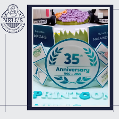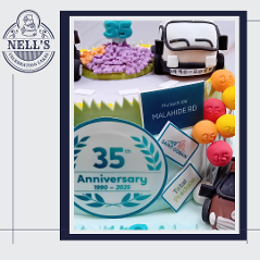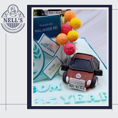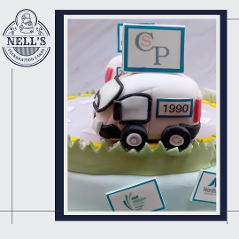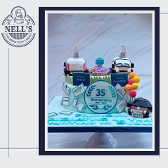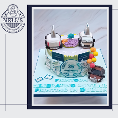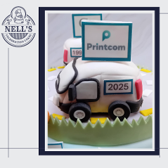 I was asked to design and make a cake to mark the 35th anniversary of Printcom, a company that has been supplying quality printed items to Dublin and beyond. The cake features two vans, one from 1990 and the other from 2025, both showing the company's logos from the two time periods. In addition, the cake features some of their customers' logos. Bronwyn, who ordered the cake, was very keen that the cake feature the beloved car of company founder, Diamuid, plus the initials of all the people who currently work for Printcom. Inside there is a 3 layer 10" red velvet cake with vanilla buttercream. Congratulations, Printcom, and here's to the next 35 years!!!