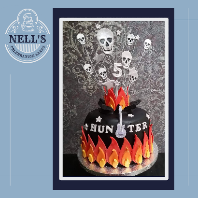 A little boy turning 5 decided he wanted a Rock 'n' Roll cake for his birthday, one with flames, skulls and an electric guitar. As we know, the customer is always right so this is his cake! Inside there's 4 layers of 8" chocolate sponge with real chocolate buttercream, covered with black fondant.