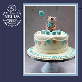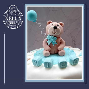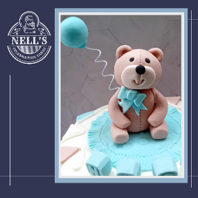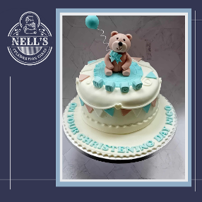 This cake was made for a little boy celebrating his baptism with a 4 layer 8" moist chocolate sponge sandwiched with real chocolate [no cocoa powder] buttercream. The cake was covered with fondant and decorated with a teddy bear sitting on a blanket, building blocks, bunting and even a balloon.