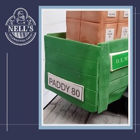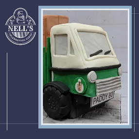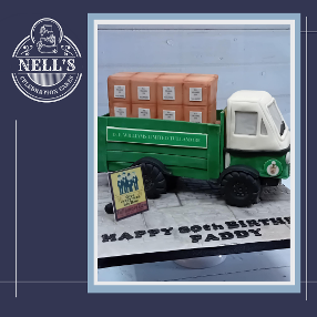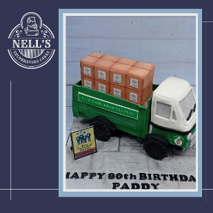 Whilst this cake was a challenge, I enjoyed the planning, the research and the execution tremendously. When Adrian asked me to make a replica of the lorry his dad drove for D. E. Williams back in the summer, I knew it was a very important celebration for his dad's 80th birthday. It was a joy to chat with Adrian and figure out the design. Here's the finished product. The total cake was 14" long and made from the equivalent of 3x8" square chocolate biscuit cakes - 3kgs of chocolate, over 2 kgs of biscuits and that's not including the butter, syrup, Crunchies or fondant! Happy birthday, Paddy.