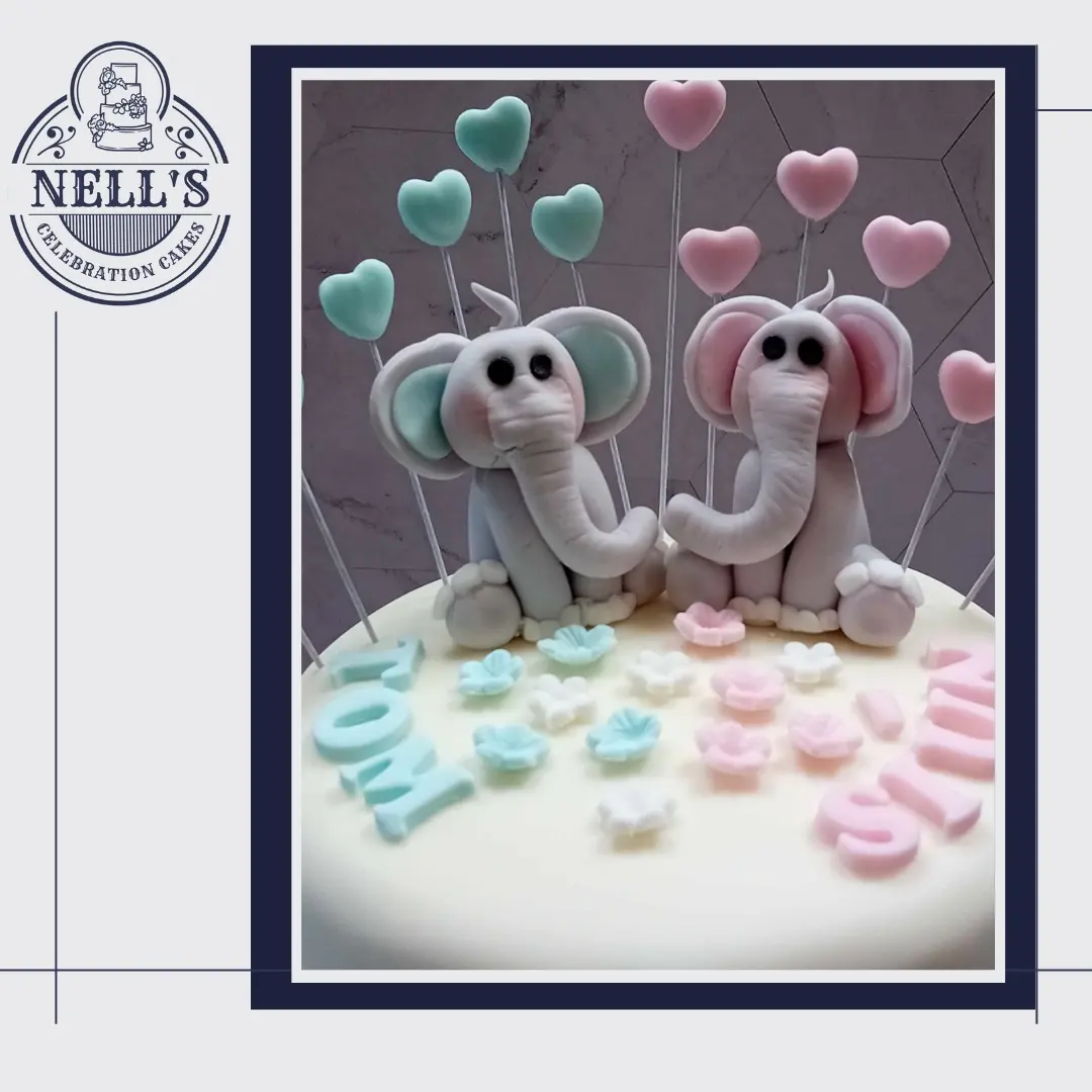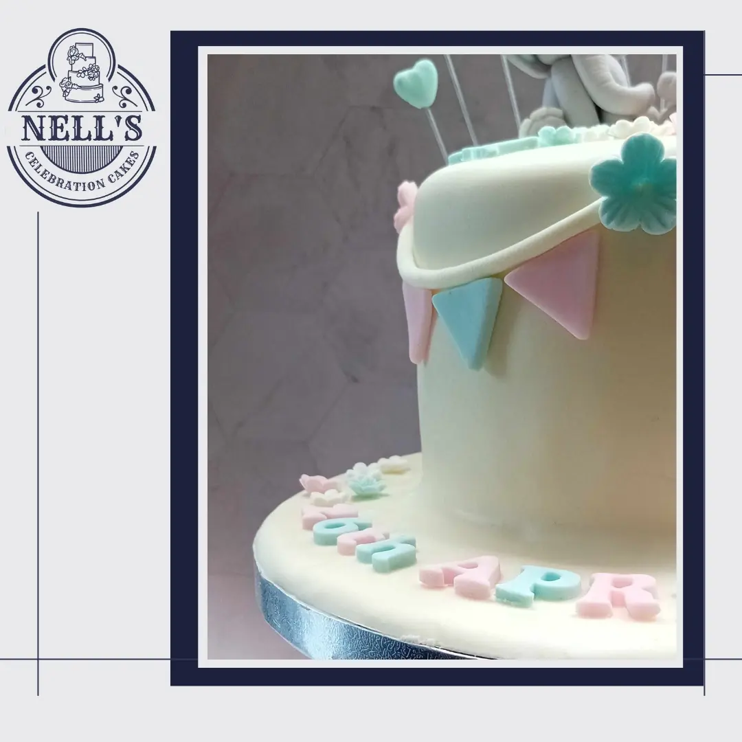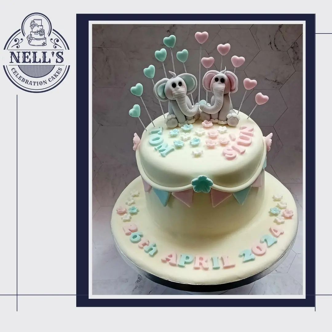 Twins, Tom and Siún celebrated their Christening with this beautiful cake. Four layers of vanilla sponge, sandwiched with Kinder buttercream and then decorated with fondant elephants, hearts and banners!